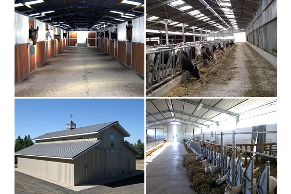 In modern cow farm, steel cow farm building are widely used. We provide the absolute best protection building that you could get for your cow. We can build any size cow farm building according to your requirements. It is also possible to create some extra space for storage and repairs or maintenance. The frame of the building consists of H section steel columns, H section steel beams and C or Z section purlins, so the structure strong enough to hold up against intense winds and heavy snow to fully protect your cow. There are two kinds of cow barn: open type and close type, it depends on your local climate and your requirement.
